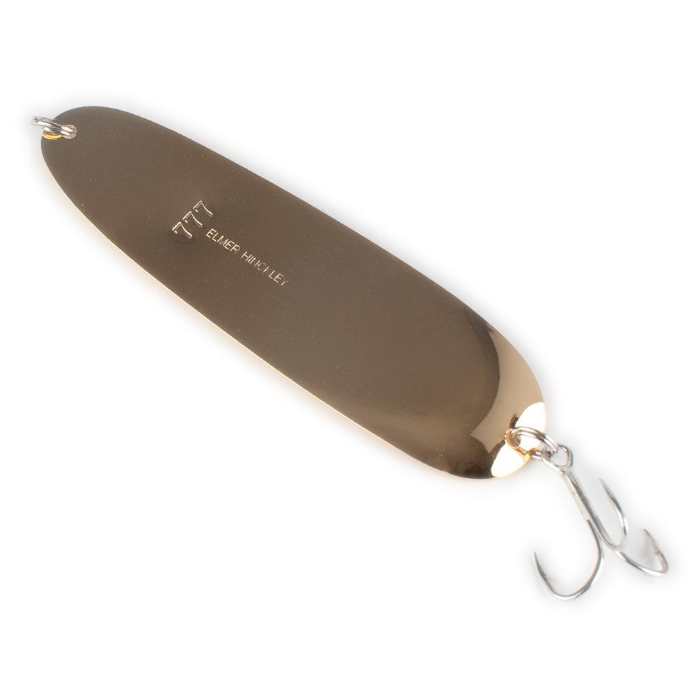 Elmer Hinckley lures are made of ultra-thin spring brass for maximum trolling action. Colors are: Silver, Gold, Copper and Black. For lures with a different color on each side: Silver/Copper and Silver/Gold. They are furnished with a treble hook on the shaped end and a split ring on the other end.