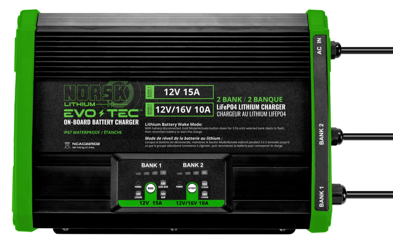 The Norsk Lithium EVO-TEC 2 Bank Onboard Chargers are a reliable and safe option for charging multiple batteries on your boat. They ensure a quick charge that gets you back on the water.